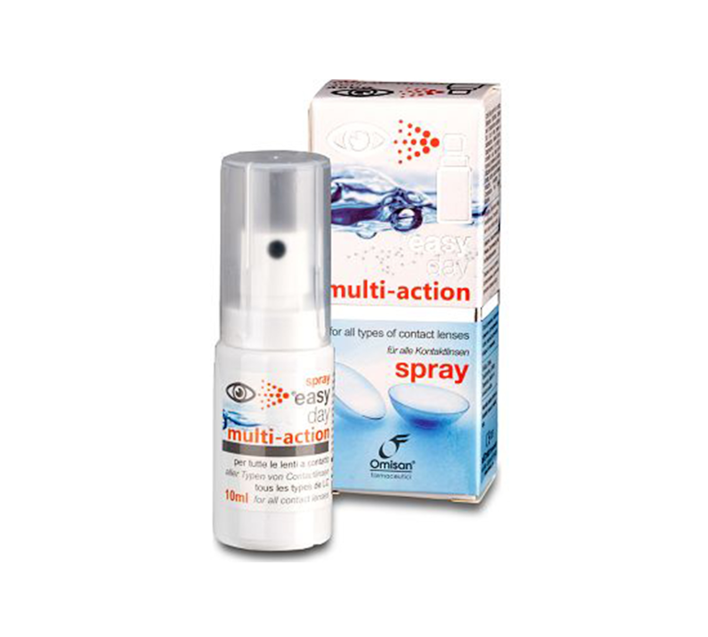Das EasyDay multi-action spray ist ein innovatives Augenspray, welches die gleichzeitige Hydrierung und Reinigung von Kontaktlinsen aller Arten bietet. Das Spray erhöht und verlängert den Tragekomfort von Kontaktlinsen spürbar und kann Verunreinigungen ohne Absetzen der Kontaktlinsen entfernen. EasyDay multi-action spray eignet sich daher besonders für die schnelle und leichte Erfrischung für unterwegs. Darüber hinaus ist EasyDay multi-action spray ideal in Fällen von Schleiersehen und ist durch den am Tränenfilm abgestimmten pH-Wert besonders verträglich.